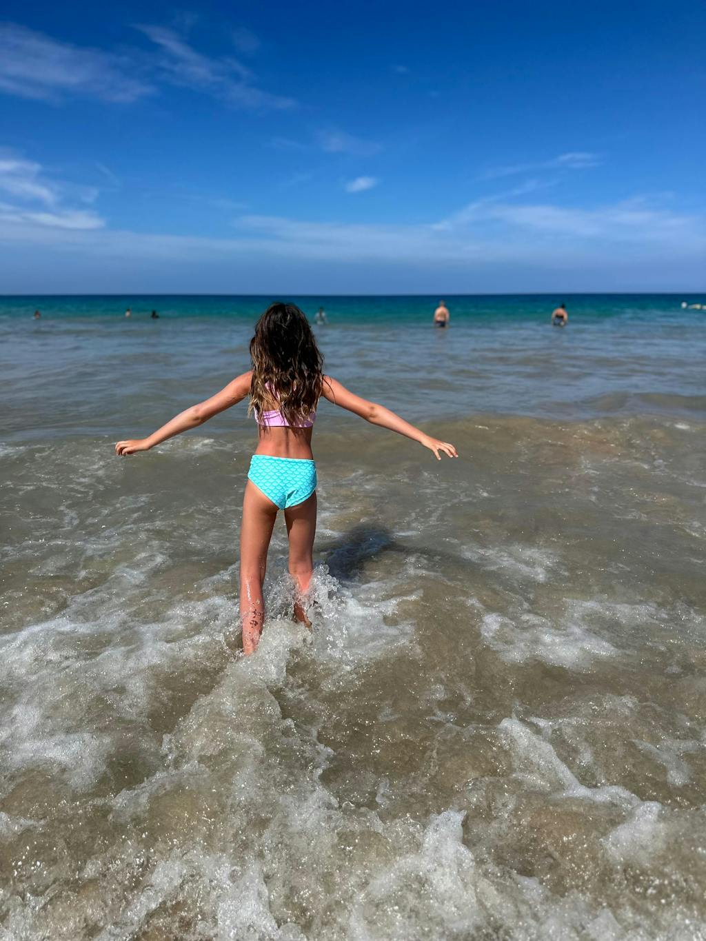 🌸 Design Detail – A mermaid-inspired two-piece swimsuit featuring a bikini top with ruffle-trimmed straps and a sparkling sequined sea star at the center. It pairs perfectly with an aqua crystal bottom, finished in a shimmery mermaid-scale pattern on glitter-printed swim fabric.