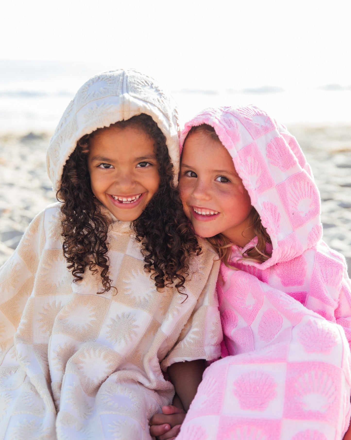 🌸 Design Detail – Hooded terry towel poncho with a subtle shell-checkered jacquard pattern and side snaps for easy changing. Ideal for beach, pool, or post-swim lounging 🎨 Prints and Colors – Available in Pop Pink