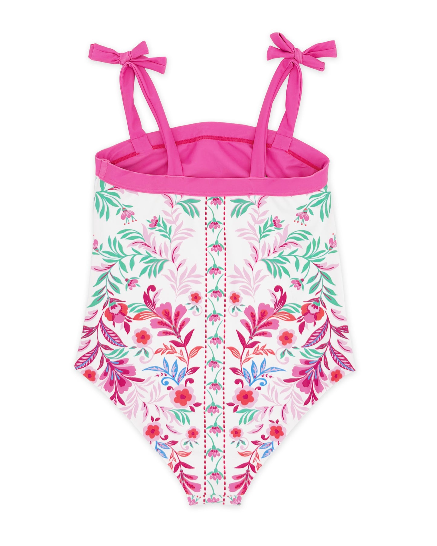 🌸 Design Detail – Features a beautiful scarf inspired print with elegant bow straps. Fixed bows in sizes 2T to 6Y, Adjustable straps in sizes 8Y to 16Y