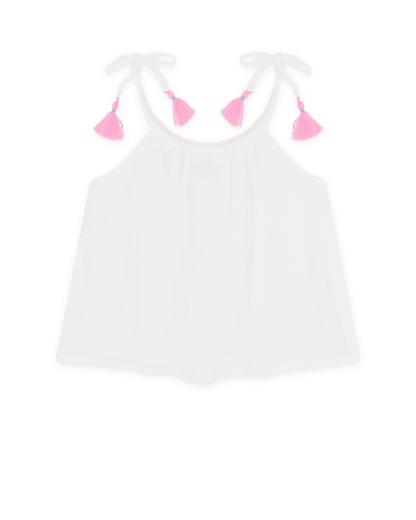 🌸 Design Detail – An adorable double gauze tank and skirt set with adjustable tie straps finished with colorful tassels. Designed with a scoop neck and flowy blouse, paired with a sweet skirt crafted with an elastic waistband and tiered ruffles for a sweet and playful fit.