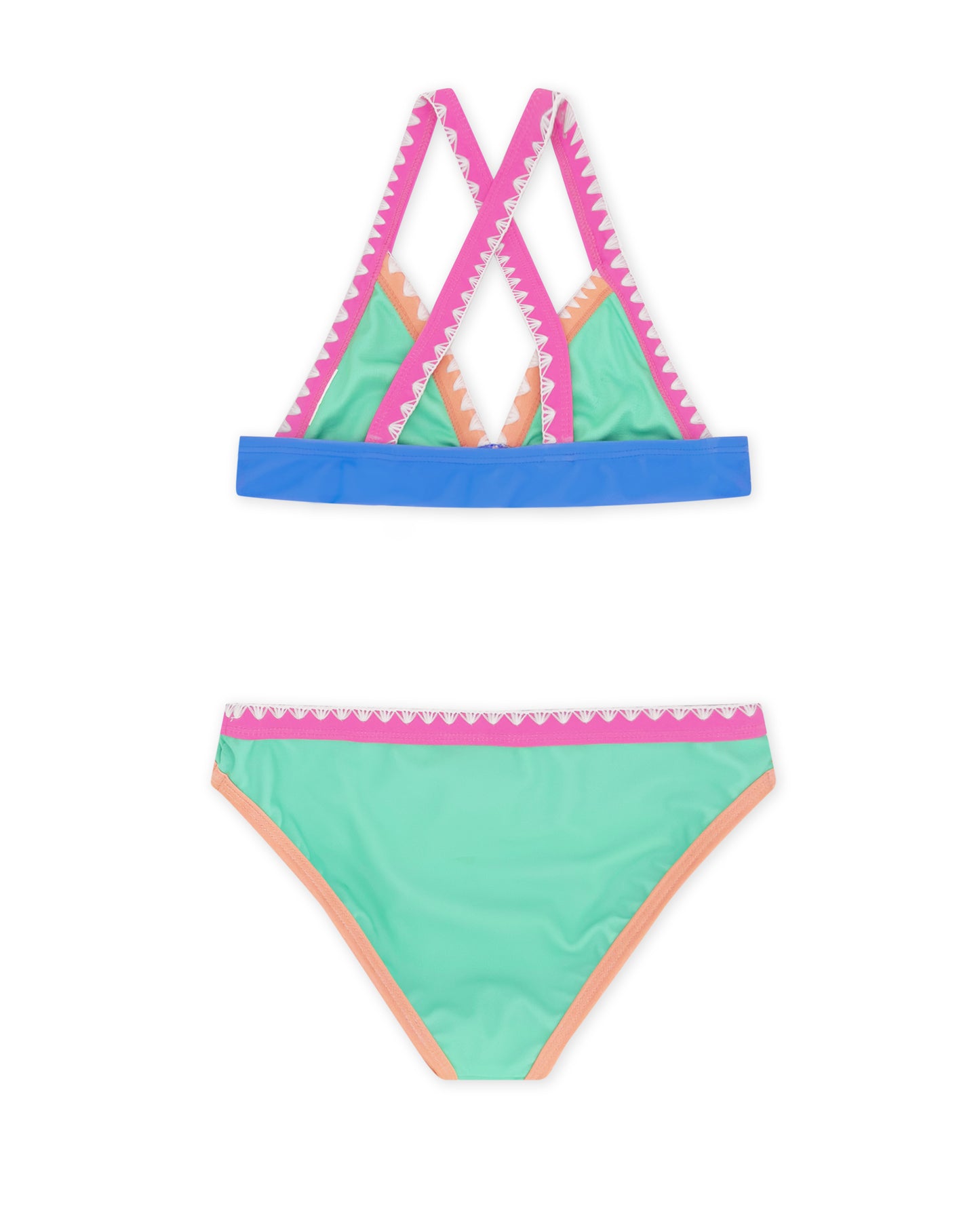 🌸 Design Detail – Triangle bikini top with criss-cross back straps for secure comfort and contrast white shell stitching for a fun, playful detail