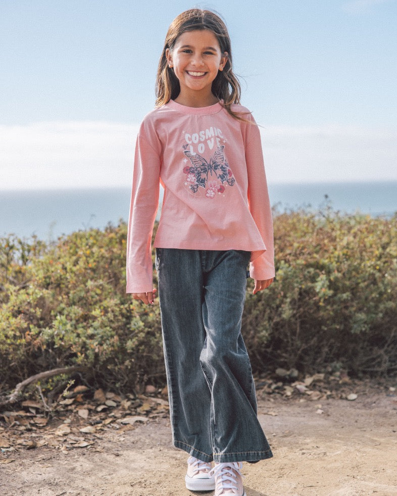 A soft denim pant with wider leg and a standard fit through waist and hips. Designed to match everything in their closet and ideal for daily wear.